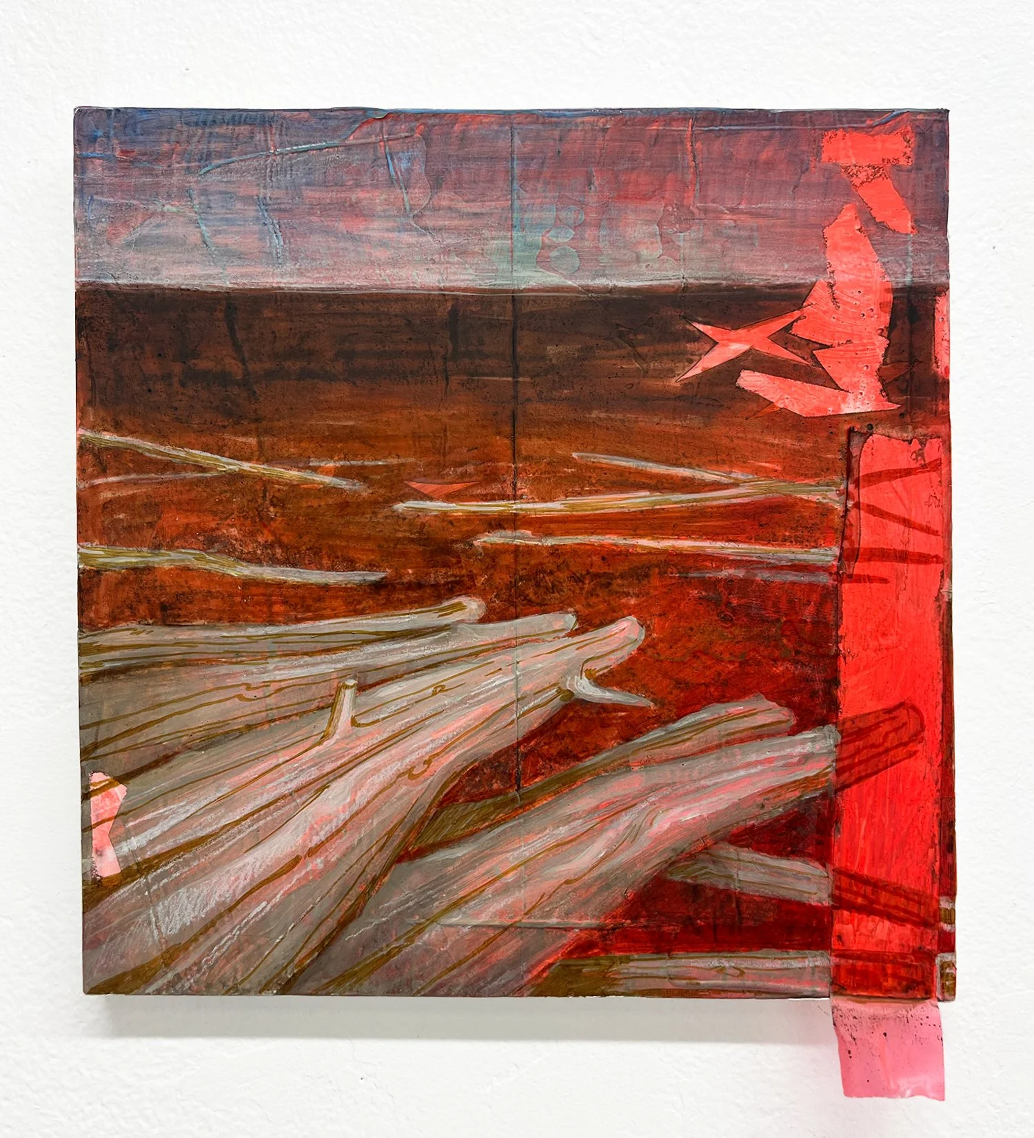 Untitled 37. Acrylic ink, black walnut hull ink, acrylic paint, pastel pencil, alcohol marker, on newsprint and cardboard. 10inx15.5. 2025